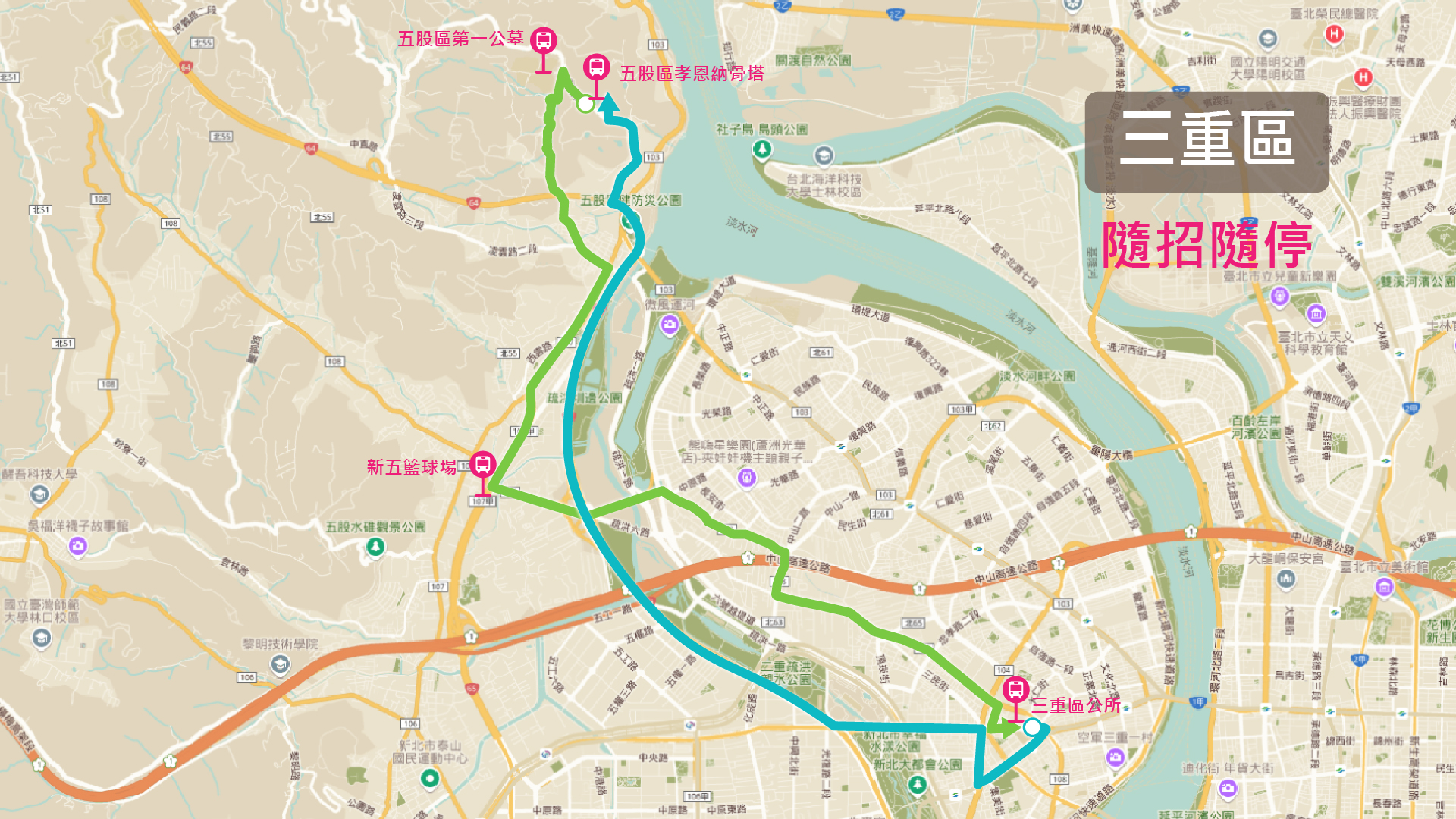 新北市三重區公所 →新北大道→捷 運菜寮站3號出口→捷運菜寮站1號 出口→新北市政府稅捐稽徵處三重分處前→臺64線→疏洪北路→成泰路四段→孝義路10號→孝義路68號 (服務站)→天乙路→成泰路三段→新五路二段→疏洪六路→中興路→中正北路→中正北路20巷→新北市三重區公所 |
